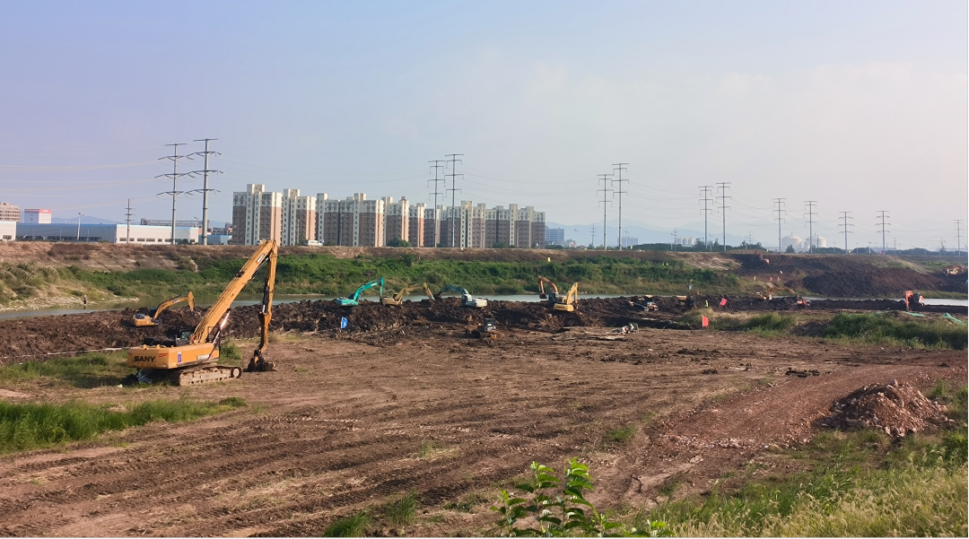 九華河下游段位于觀前圩至入江口,治理河道長9.3km,涉及保護(hù)人口3.23萬人,保護(hù)耕地2.26萬畝。主要建設(shè)內(nèi)容為堤防工程長1.67km,河道清淤長4.7km,護(hù)坡護(hù)岸工程長1.7km,新建九華河出口控制工程。項(xiàng)目總投資2.7億元。下游段現(xiàn)場投入反鏟挖機(jī)14臺(tái)、推土機(jī)3臺(tái)、自卸汽車3輛,施工、管理人員35名,開展用水用電布置、導(dǎo)流、縱向圍堰開挖等工作。